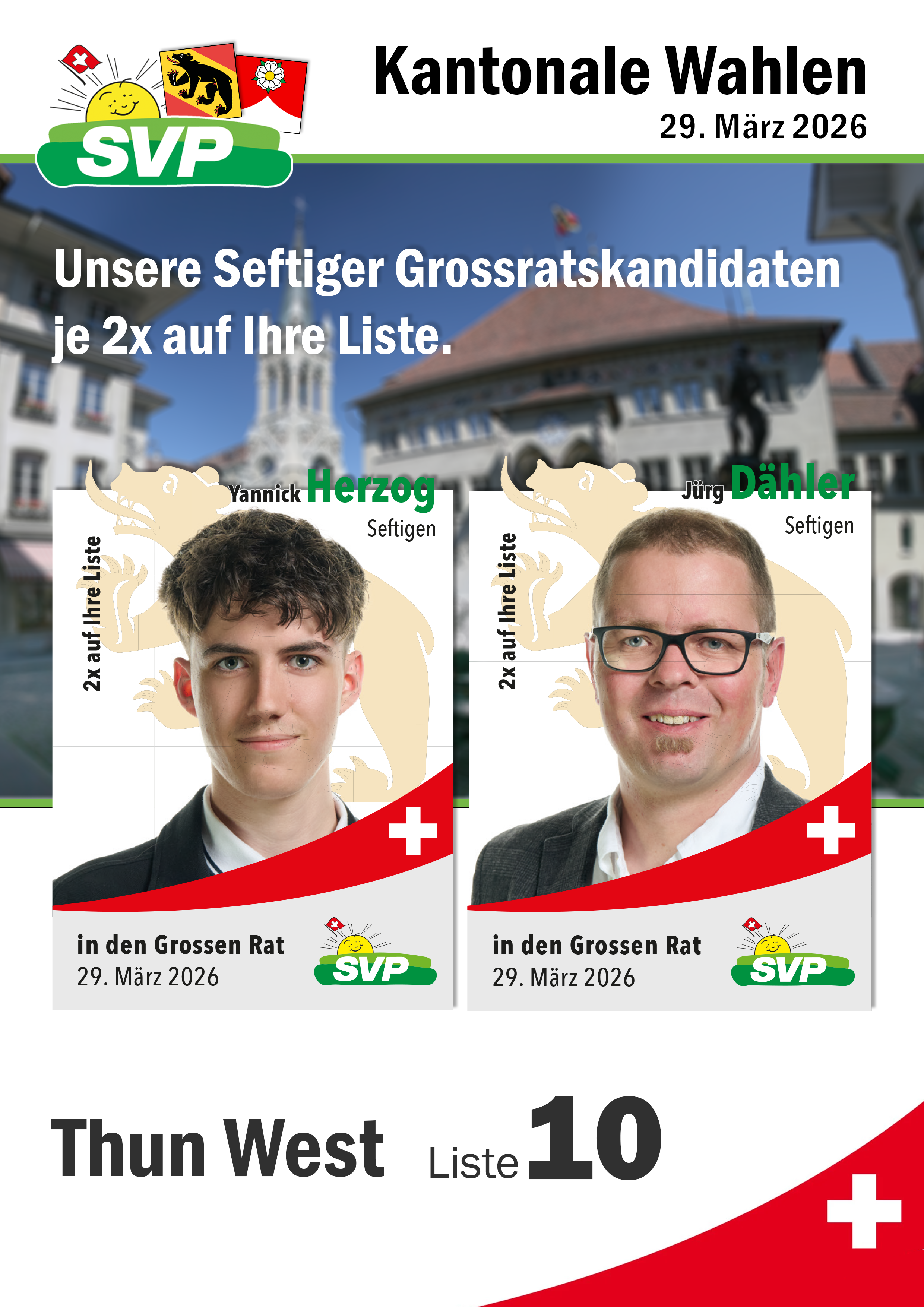 Wählen ist wichtig, so dass die Haltungen der SVP auch bei neuen Gesetzen oder Gesetzesanpassungen miteinfliessn können. Da ich die meisten SVP Kandidaten kenne empfehle ich Ihnen diese Kadidatinnen und Kandidaten zur Wahl und bitte Sie eine der beiden SVP Listen (nur 1, sonst ist die Wahl ungültig) unverändert einzulegen. Bei der Ständeratswahl empfehle ich die Wiederwahl von Ständerat Werner Salzmann (von Hand auf den Wahlzettel schreiben). Vielen Dank für Ihre Unterstützung.